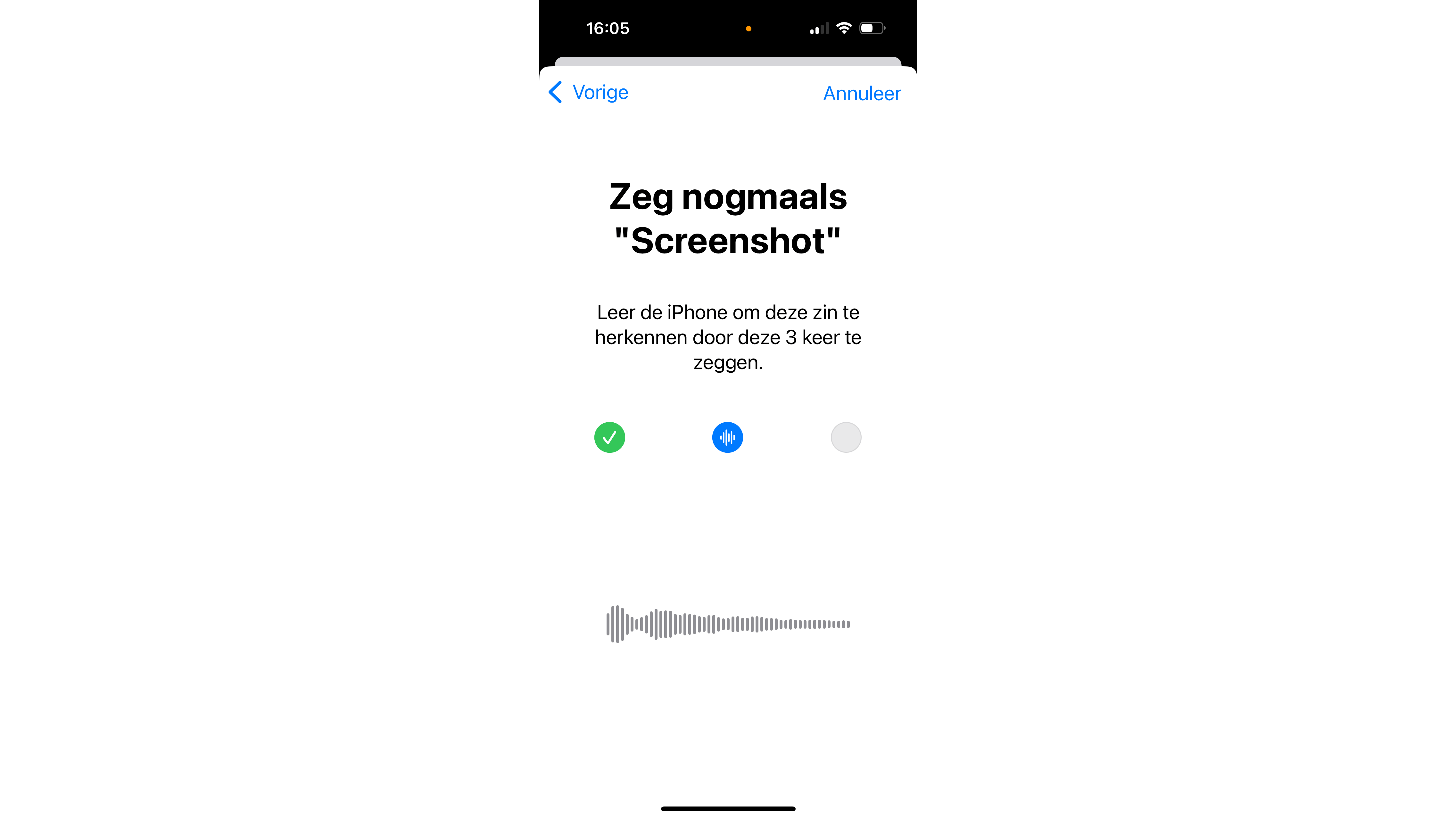 In het volgende scherm moet je drie keer een zelfbedacht commando uitspreken dat als trigger voor de spraakopdracht zal dienen. Daarna zie je het scherm Taak is gereed. Klik op de knop Ga door of gebruik de knop Voeg er nog een toe. Wanneer je nu bijvoorbeeld tijdens het browsen het woord Screenshot uitspreekt, zal de iPhone meteen een schermafbeelding maken en opslaan, zonder dat je verder iets hoeft te doen.