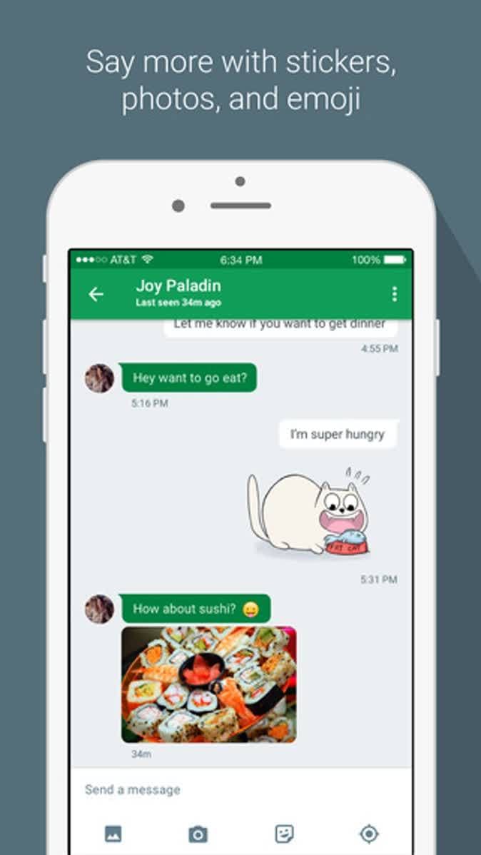 Onderaan het chatscherm staat een nieuw menusysteem waarin je uit vier opties kunt kiezen. Helemaal rechts staat een knop waarmee je, net als in iMessage, je locatie kunt delen door middel van Google Maps en Hangouts. Deze functie is niet nieuw, maar het werkte voorheen niet goed en er was geen aparte knop voor.