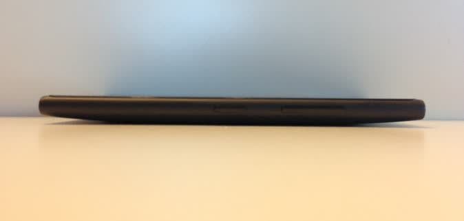 De achterkant is bol, waardoor de Lumia 735 lekker in de hand ligt, maar wel wat bibbert op het tafelblad.