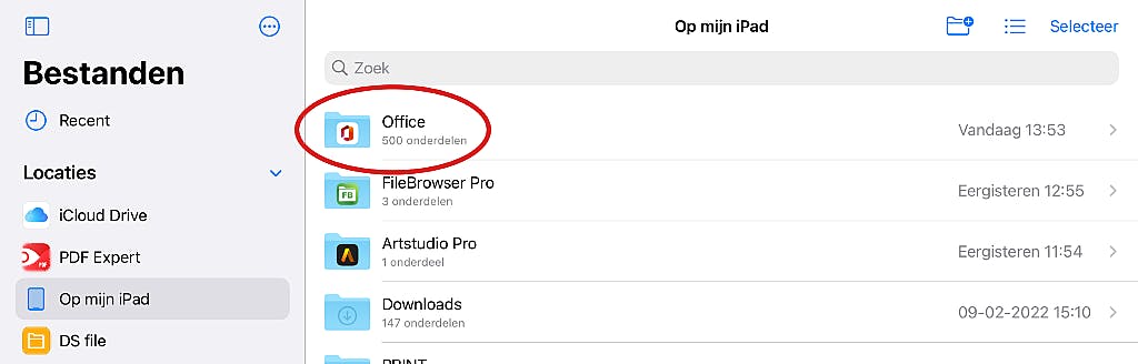 Omdat velen hun – met name – iPad ook gebruiken onderweg, ongetwijfeld ook op plekken waar even geen internet voorhanden is, is het zaak om voordat je de losse Office-onderdelen verwijdert even checkt wat er in de documentmappen rondzwerft. Start daarvoor de app Bestanden en blader naar Op mijn iPad; te vinden in de kolom links.