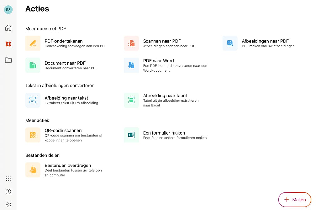 Verder heeft de Office-app zoals gezegd wat bonus-onderdelen aan boord. Tik in de kolom links op de knop met vier balletjes. Je ziet nu diverse verdraaid handige tools, allemaal ingebouwd en klaar voor gebruik. Ze spreken – qua naam – voor zichzelf. Zo kun je bijvoorbeeld een PDF-bestand omzetten naar een bewerkbaar bestand in Word, OCR loslaten op afbeeldingen en daar vervolgens tekst of tabelllen uit halen. Maar ook het maken van een PDF’je van een selectie aan foto’s, QR-codes scannen en formulieren maken behoort tot de mogelijkheden.