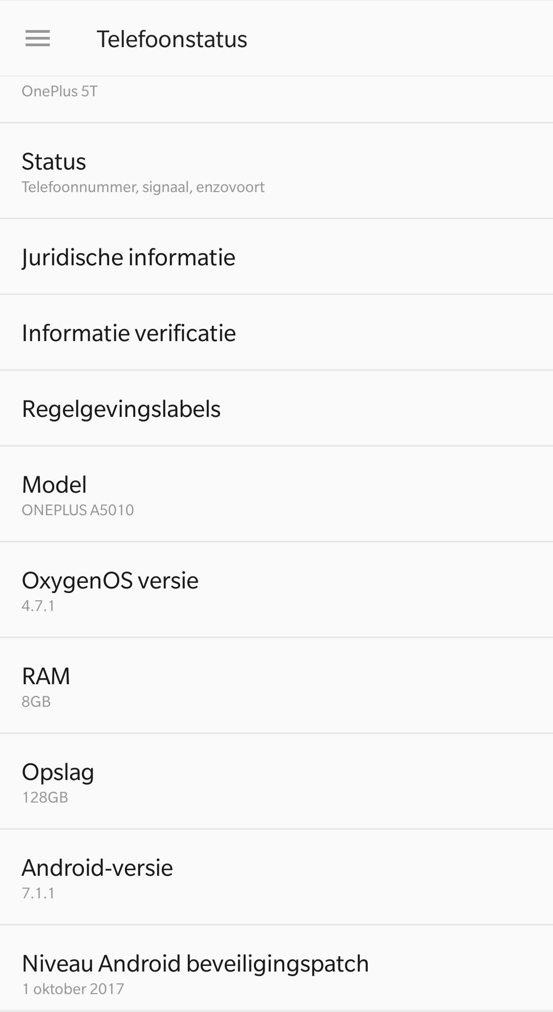 **Prijs** € 499,- / € 559,- **Kleur** Zwart **OS** Android 7.1 **Scherm** 6 inch amoled (2160 x1080) **Processor** 2,45 GHz octacore (Qualcomm Snapdragon 835) **RAM** 6GB / 8GB **Opslag** 64 GB / 128 GB **Batterij** 3.300 mAh **Camera** 16 en 20 megapixel (achter), 16 megapixel (voor) **Connectiviteit** 4G (LTE), Bluetooth 4.1, wifi, gps **Formaat** 15,6 x 7,5 x 0,7 cm **Gewicht** 162 gram **Overig** Vingerafdrukscanner, usb-c, dualsim , snellader, koptelefoonpoort **Website** [http://oneplus.net](https://oneplus.net/nl/5t)
