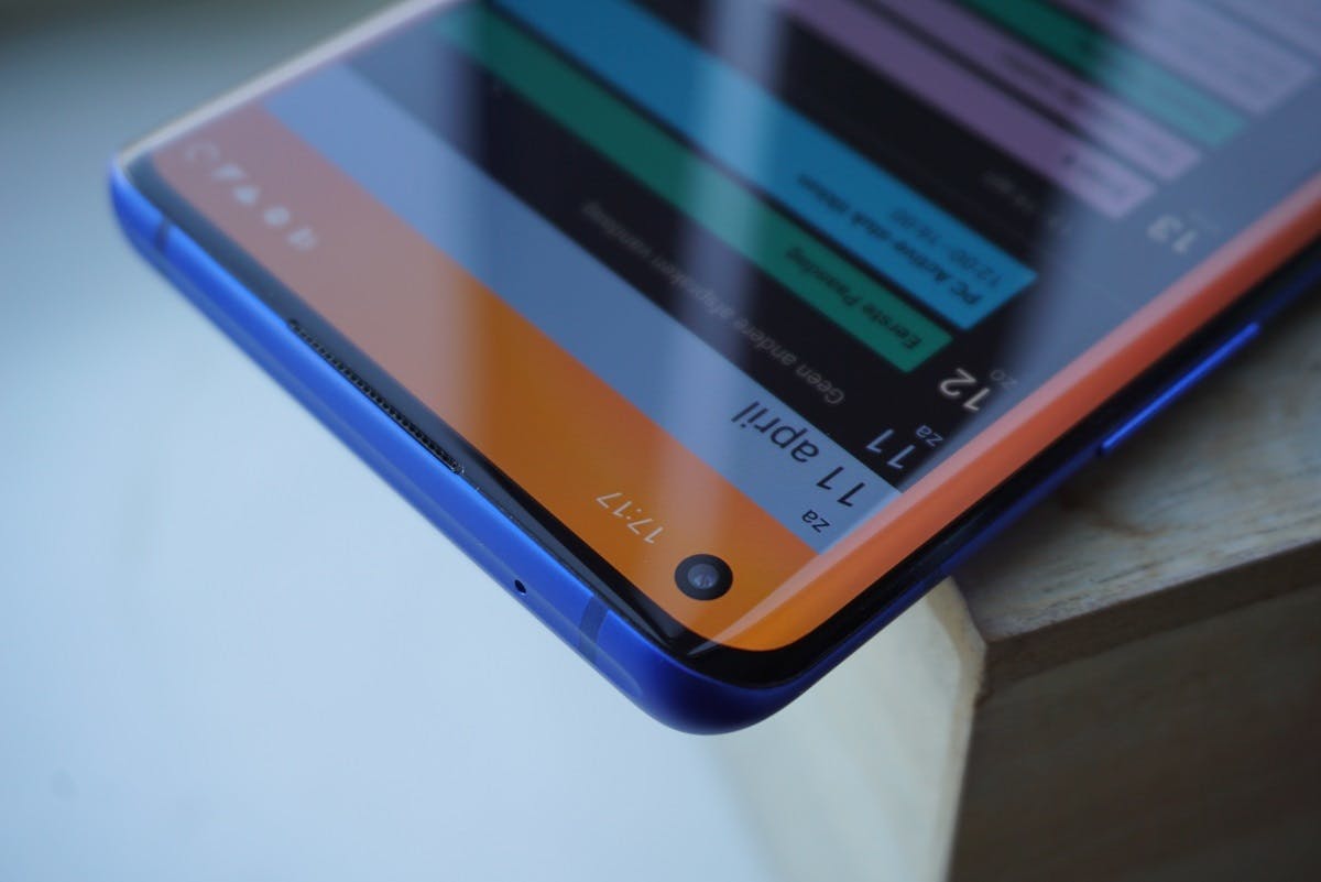 Te beginnen met de buitenkant. De OnePlus 8 Pro is gemaakt van glas en te koop in drie kleuren; zwart, groen en blauw. Die laatste twee kleuren vallen op ten opzichte van de concurrentie, en ik vind mijn blauwe testmodel er erg fraai uitzien. Het toestel ligt door zijn gebolde achterkant en afgeronde hoeken prettig in de hand; naar mijn mening prettiger dan de iPhone 11 Pro. De voorkant van de 8 Pro bestaat bijna helemaal uit scherm, met smalle randen boven en onder het display. In de linkerbovenhoek van het scherm zit een klein gaatje voor de selfiecamera, een ontwerpwijziging ten opzichte van de 7(T) Pro van vorig jaar. Die gebruikt een uitschuifbare selfiecamera om een randloos scherm mogelijk te maken. De cameramodule op de achterkant van de 8 Pro steekt iets uit de behuizing, waardoor de telefoon niet helemaal plat op tafel ligt. Een hoesje verhelpt dit.