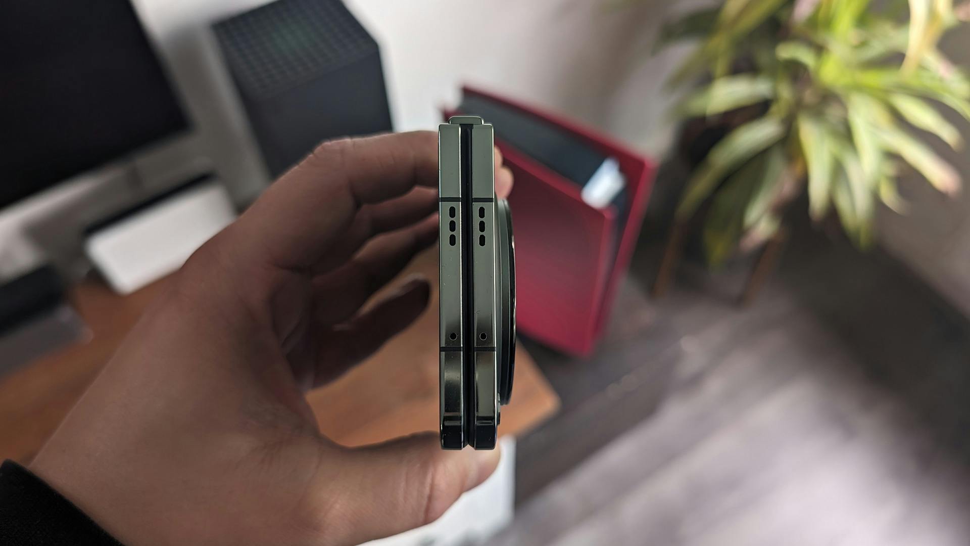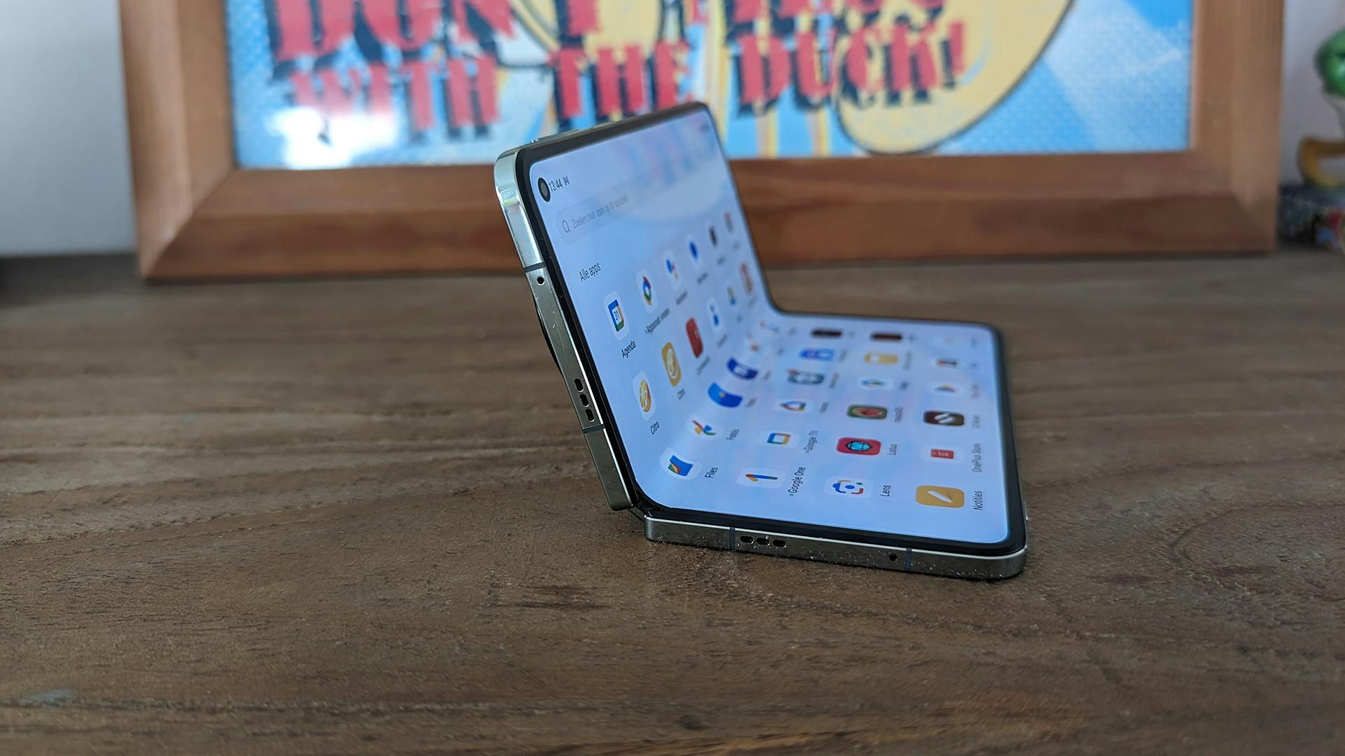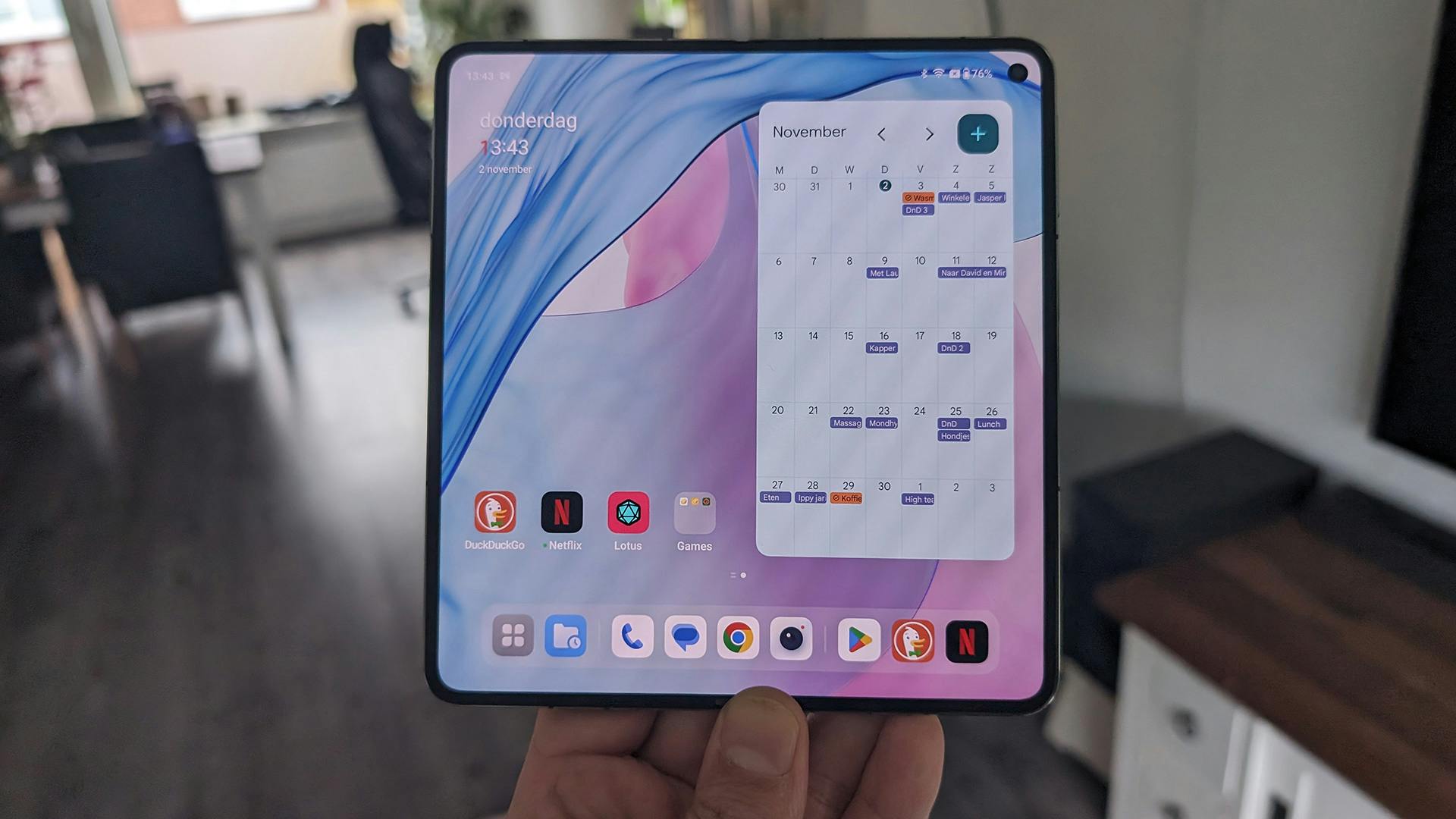 Het vouwen/dichtklappen zelf voelt na bijna een maand gebruik nog steeds bevredigend aan. Het kost heel weinig moeite het toestel open en dicht te vouwen, omdat de OnePlus Open het werk na een bepaalde hoek voor je uit handen neemt. Dan klapt-ie ineens open (of juist dicht), zonder dat je ervan schrikt. Dat gaat geleidelijk maar vlot. Helaas betekent dat ook dat je het toestel niet in elke hoek kunt openvouwen. Na een bepaald aantal graden heeft het scharnier de behoefte om helemaal opgevouwen te worden. Je kunt het scherm dus niet in elke hoek plaatsen die je wil, en dat is best jammer.