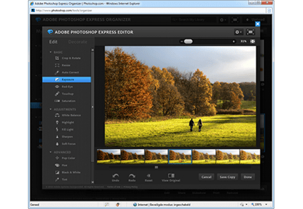 Ook Adobe biedt een gratis online fotobewerker aan. Behalve platen bewerken, kunt u ze met deze dienst ook in online webalbums opslaan en ze eventueel delen met anderen. Bewerken doet u via de zogeheten Photoshop Express Editor en hiervoor kunt u foto's op twee manieren selecteren. Allereerst kunt u een foto op uw computer aanwijzen. Het handige hieraan is dat u zo desnoods door uw volledige fotoarchief kunt bladeren. Bij de tweede manier bewerkt u foto's die u in webalbums hebt geplaatst. Het voordeel daarvan is dat u vanaf elke locatie met een internetaansluiting bij uw beelden kunt, ze staan immers online. Welke methode u ook kiest, met Express Editor bent niet langer afhankelijk van die ene computer waarop de lokale software is geïnstalleerd.