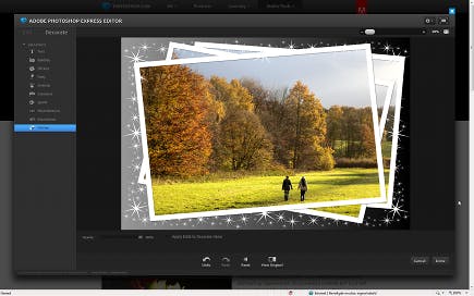 Omdat u uit voorgebakken miniaturen kiest en er geen schuifregelaars en geavanceerde gereedschappen zijn, is Photoshop Express Editor vooral handig voor wie snel en eenvoudig foto's wil verbeteren. Wilt u foto's verfraaien met kaders en versiersels, dan kunt u zich heerlijk uitleven op het tabblad Decorate. Zo kan na een klik op Frames uit een flink aantal fotolijsten worden gekozen. Het is mogelijk om meerdere fotolijsten toe te voegen, wat vooral handig is als u delen van een foto wilt omlijsten. U verkleint een fotolijst dan via de handgrepen (vierkantjes) in het kader. Zodra de muispijl in een handje verandert, versleept u de lijst naar de juiste plek. Roteren kan met het bolletje aan de bovenzijde.