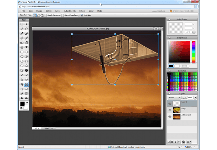 Combineert u stukjes uit verschillende foto's, dan moeten ze wel goed bij elkaar passen. U kunt ze op elkaar aan laten sluiten door ze te schalen. Gebruik eerst Select / Select Pixels om alle pixels van een laag te selecteren en gebruik vervolgens het gereedschap Free Transform/Rotate Tool om het beeldelement op deze laag de juiste grootte te geven. Slepen met de hoekpunten werkt daarbij het eenvoudigst. Houdt u de Shift-toets ingedrukt, dan blijft de lengte/breedteverhouding behouden. Druk op Enter om de bewerking te bevestigen. Zodra u helemaal klaar bent, bewaart u de foto op uw pc via File / Save to My Computer. Kies JPG of PNG en klik op Save.