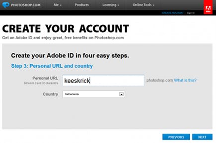 Om in Photoshop Express Editor (zie tip 4) gebruik te maken van online foto's, gaat u wederom naar Photoshop. Nu moet u zich wel aanmelden, in tegenstelling tot wat we eerder hebben uitgelegd rond de bewerking van 'lokaal opgeslagen' foto's. Hebt u nog geen Adobe ID, dan registreert u zich eerst via Create account. Door bij Personal URL een naam op te geven, zijn uw foto's straks rechtstreeks bereikbaar via uw eigen unieke webadres. Vergeet niet om na het registreren de e-mail te bevestigen die Adobe u toestuurt. Tik vervolgens in het adresvak van de browser uw eigen webadres in (dat heeft de vorm 'mijnnaam.photoshop.com') en meld u aan bij de dienst.