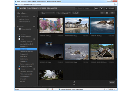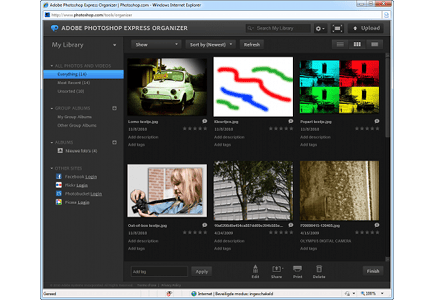 Ook foto's die u in webalbums bij andere online diensten hebt geplaatst, kunt u rechtstreeks vanuit Photoshop Express Organizer bekijken en zelfs bewerken. Klik links onder het kopje Other sites op een dienst waar u foto's hebt geplaatst, meld u aan en bevestig het verzoek tot toegang dat u te zien krijgt. Vanaf dit moment zijn uw albums met foto's rechtstreeks vanuit Organizer beschikbaar. Bewerken met Photoshop Express Editor kan nu door op een foto te klikken en in de rechteronderhoek te kiezen voor Photo Options / Edit Photo. Zodra u klaar bent, klikt u weer op Done. De originele foto wordt niet overschreven, er wordt een nieuwe versie bijgeplaatst.