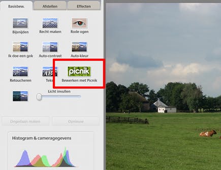 Gebruikt u het programma Picasa om de foto's op uw pc te organiseren en te bekijken? Vanaf versie 3.8 kunt u rechtstreeks vanuit Picasa foto's bewerken met de beroemde online fotobewerker Picnik. Dit werkt als volgt. Eerst bekijkt u met Picasa een foto op het scherm (door hem met een muisklik te selecteren en vervolgens op Enter te drukken). Links naast de foto klikt u op het tabblad Basisbewerkingen (afgekort tot Basisbew.) op het pictogram van Picnik. Na een mededeling wordt de foto naar Picnik verstuurd en kunt u online aan de slag. Aanpassingen aan belichting en kleur voert u in Picnik door op het tabblad Edit. Verkleinen, een uitsnede maken of rode ogen uit een portretfoto verwijderen kan hier ook. Via het tabblad Create voegt u eventueel wat versiersels aan uw foto toe. Helaas is niet alles gratis: zodra het woord 'Premium' ergens voor staat, gaat het om een betaalde functionaliteit.