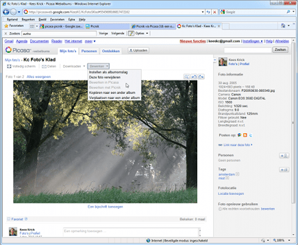 Bewerken kan nu door de muispijl naar een foto te bewegen, op het pijltje in de rechteronderhoek te klikken en te kiezen voor Edit. Zodra u klaar bent, klikt u rechtsboven de foto op het pictogram van een groen tandwiel en kiest u Close Photo. Er verschijnt nu een venster waarin u wordt gevraagd of u de gewijzigde foto in het Picasa-webalbum wilt bewaren. Aan u de keuze of u het origineel wilt overschrijven of de foto als een nieuw bestand wilt bewaren.