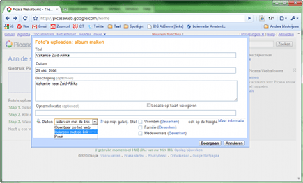 Ga naar picasaweb.google.com en log in met uw Google-account (bijvoorbeeld Gmail) of maak een nieuw account aan. U kunt foto’s uploaden naar uw Picasa Webalbums-account vanuit Picasa of vanuit de webinterface. Om te uploaden vanuit Picasa start u het programma, selecteert u de foto’s die u wilt uploaden en klikt u op de knop Uploaden. Voer hier de gevraagde gegevens in. Met de instelling onder Zichtbaarheid voor dit album bepaalt u wie het album mag bekijken. Openbaar wil zeggen dat iedereen de foto’s kan zien, met Niet vermeld heeft iemand een link nodig om het album te bekijken en met Aanmelding vereist voor weergave moeten kijkers zich ook nog met hun Google-account aanmelden. Maak een keuze en klik op Uploaden.