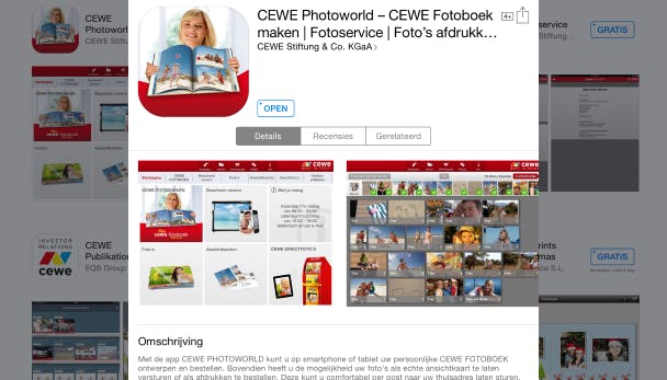 Allereerst moeten we de app van CEWE installeren. Open de App Store en tik in de rechterbovenhoek op het zoekvenster. Voer 'cewe' in en tik op Zoek. Je zult meerdere resultaten te zien krijgen. De app die wij nodig hebben heet CEWE Photoworld. Tik op Gratis en Installeer en geef daarna nog even het wachtwoord dat bij je Apple ID hoort in. Bevestig met OK. Na de installatie tik je op Open om de app te starten.