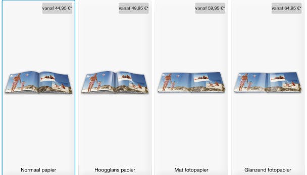 Bij grote fotoboeken kun je zelf een papiersoort kiezen. Bij kleinere albums krijg je standaard normaal papier.