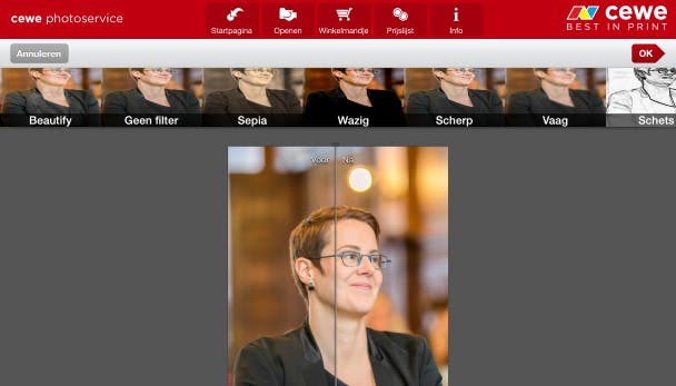 Is die ene foto te donker of te onscherp? CEWE heeft een editor in de app verwerkt waardoor je je foto's een beetje kunt verbeteren. Tik op één specifieke foto in het album en kies Bewerken. Met de zogenoemde Beautify-knop kun je bijvoorbeeld portretten verzachten. Daarnaast is er nog een Sepia-filter en kun je foto's verscherpen, vervagen of omzetten naar een schets. Met de Voor/Na-lijn in het midden van de foto kun je het resultaat van de filter zien. Tevreden? Dan ga je verder met de OK rechtsboven.