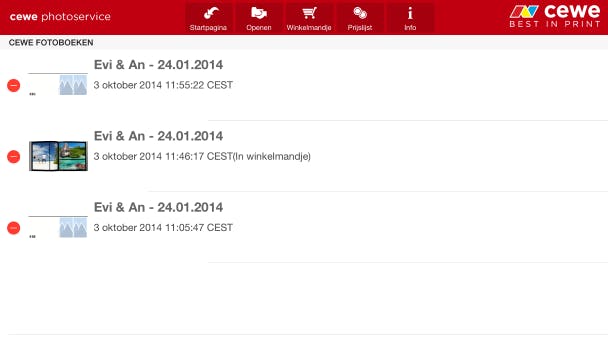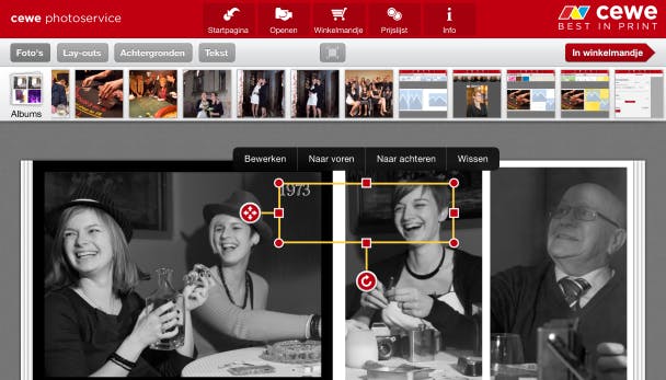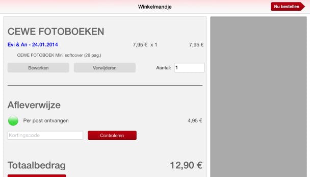 Tevreden met het resultaat? Gebruik de pijltjesknoppen om je album nog een laatste keer te controleren en tik daarna op In winkelmandje in de rechterbovenhoek. CEWE berekent de totaalprijs en even later kun je op Nu bestellen tikken. Tik op Registreren om een account aan te maken of log in als je in het verleden al eens een bestelling geplaatst hebt bij CEWE. Betalen kan via overschrijving of creditcard. Voltooi met Nu bestellen. De vermoedelijke levertijd kun je onmiddellijk aflezen.