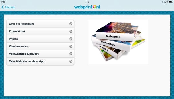 Eigenlijk zou elke app zo simpel moeten zijn als Webprint Fotoalbum. Kies de foto's die je in een fotoboek wilt, pas eventueel de volgorde aan en klaar. Helaas zijn er toch nog enkele mankementen. Je kunt bijvoorbeeld je foto's wel roteren, maar zoomen of verplaatsen is niet mogelijk. Wel interessant is dat je het album dat je hier maakt ook onmiddellijk op je Facebook-profiel kunt delen. Album bestellen? Voorlopig kan dat enkel in 10x15 cm of 13x18 cm. Gebruiksvriendelijk maar er is nog werk aan de winkel voor de ontwikkelaars!