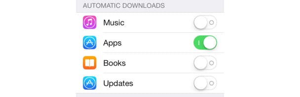 iOS 7 heeft een vergelijkbare functie, maar je moet er eerst voor zorgen dat de functie aanstaat. Om dit te controleren, open de Settings app, scrol omlaag, en druk op iTunes & App Store. Van hieruit zoek je naar het gedeelte Automatic Downloads, en verschuif de Apps schuifbalk zodat de functie aan staat (de knop wordt dan vanzelf groen). Als je automatisch updates naar je telefoon wilt downloaden, verschuif de Updates schuifbalk dan ook naar ON.