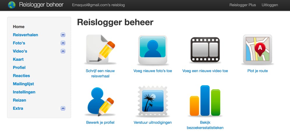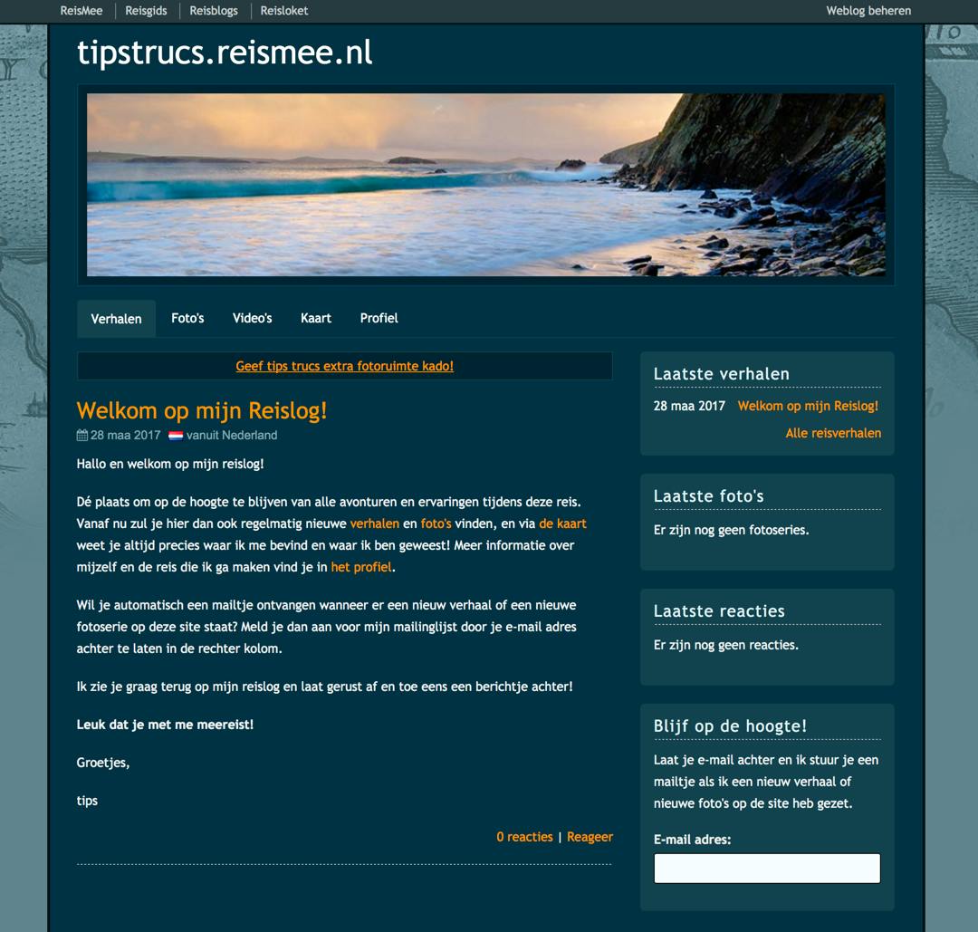 Een gelijkaardig platform is ReisMee.nl. Ook hier kun je je reiservaringen delen met vrienden, collega’s, familieleden of onbekenden. Het communitygevoel is hier heel groot. Dat merk je bijvoorbeeld aan de tips. Via ReisMee.nl is het erg eenvoudig om informatie te delen, contacten te leggen én deze te onderhouden. Een account kost je niets. Na de registratieprocedure krijg je een blog in de vorm van jouwnaam.reismee.nl. Er zijn zeven verschillende thema’s; van erg kleurrijk tot zeer minimalistisch. Je kunt een mailinglist aanmaken en je blog afschermen met een wachtwoord. Een reisverhaal maken is eenvoudig. Je kunt naar hartenlust experimenteren met de opmaak en links, bullets, emoji’s, foto’s en videofragmenten invoegen. Enig minpuntje is dat je standaard maar ruimte krijgt voor 200 afbeeldingen. Wil je 200 foto’s extra kwijt kunnen? Dan betaal je daar 11 euro voor. Een pakket van 500 extra foto’s kost 19 euro. Heb je eigenlijk behoefte aan meer fotoruimte, en wil het thuisfront graag z’n steentje bijdragen aan jouw reis, dan kan dat, want ReisMee maakt het mogelijk om fotoruimte cadeau te geven.