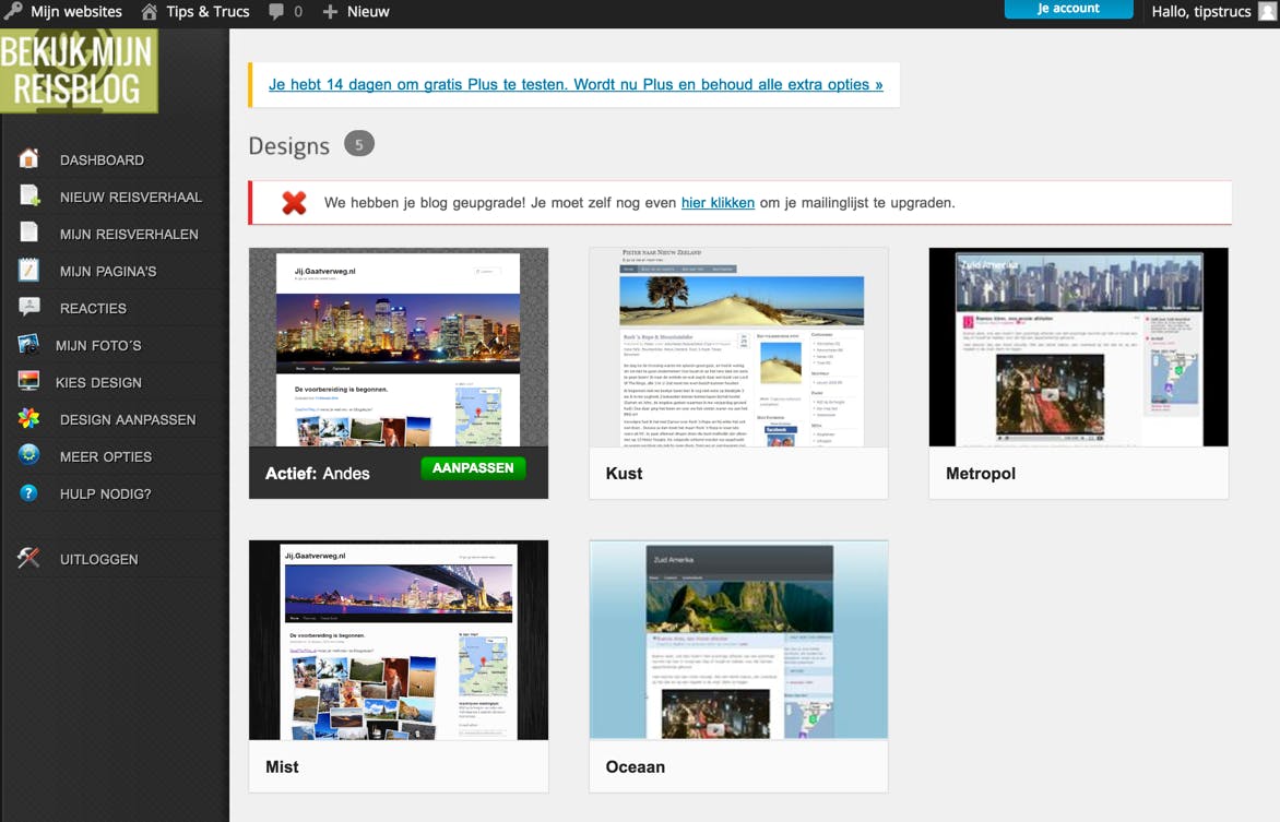 De meeste gratis reisblogs werken via een verdienmodel met advertenties. Heb je daar een bloedhekel aan of wil je je bezoekers niet lastigvallen met allerhande reclameboodschappen? Dan kun je Gaatverweg.nl overwegen. Een ander voordeel is dat de thema’s ietwat moderner en frisser ogen dan die van de gemiddelde reisblog. Het cms is gebaseerd op WordPress en dus erg veelzijdig. Gaatverweg.nl biedt vier verschillende formules aan. De basisversie is gratis en volledig advertentievrij, maar biedt maar 50 MB ruimte voor je foto’s. Is dat voor jou onvoldoende? Een Plus-account (3,50 euro per maand) geeft je 75 MB opslagruimte en met dit account kun je eveneens mobiel bloggen (offline schrijven en pas uploaden als je wifi hebt). Met de Plus Foto-formule (7,50 euro per maand) krijg je 250 MB en Ultimate Foto (12,50 euro per maand) bevat 500 MB fotoruimte. De url naar jouw eigen blog is in alle gevallen jouwnaam.gaatverweg.nl.