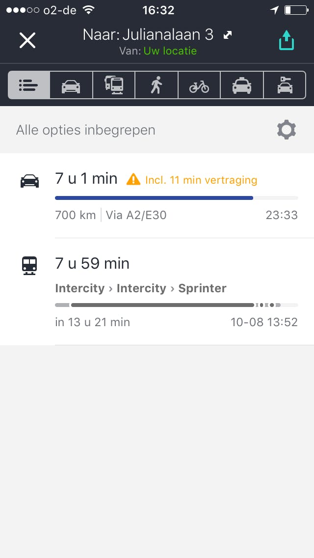 Eronder worden nog eventuele andere routeopties gegeven, je ziet bijvoorbeeld een trein-optie of een optie om met de fiets of lopend naar je bestemming te komen. Wil je meer opties zien, dan tik je op één van de vervoersmiddelen bovenin.