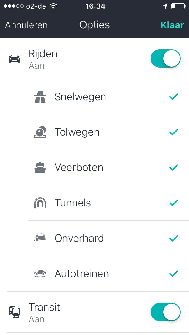 Standaard staat er boven de resultaten Alle opties inbegrepen. Tik op het tandwieltje om dit te wijzigen. Nu kun je per vervoersmiddel opties selecteren. Bij Rijden zet je bijvoorbeeld Veerboten uit en onder Transit kun je ervoor kiezen om Bussen en Kabelspoorwegen uit te zetten.