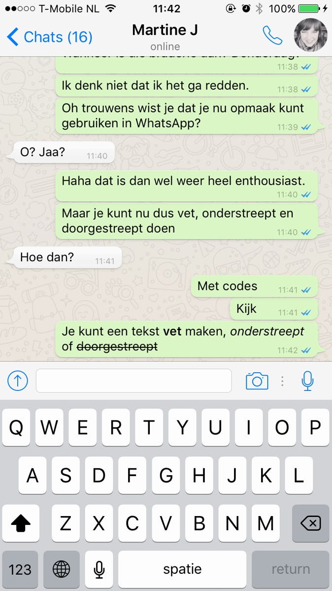 Let op: in iOS werkt de opmaak nog niet in Berichtencentrum, dus de notificaties die je krijgt tonen sterretjes, streepjes enzovoort, maar in het bericht zelf zal de opmaak wél zichtbaar zijn. Het kan zijn dat je WhatsApp eerst moet updaten naar de nieuwste versie voor je de nieuwe opmaakfuncties kunt gebruiken.