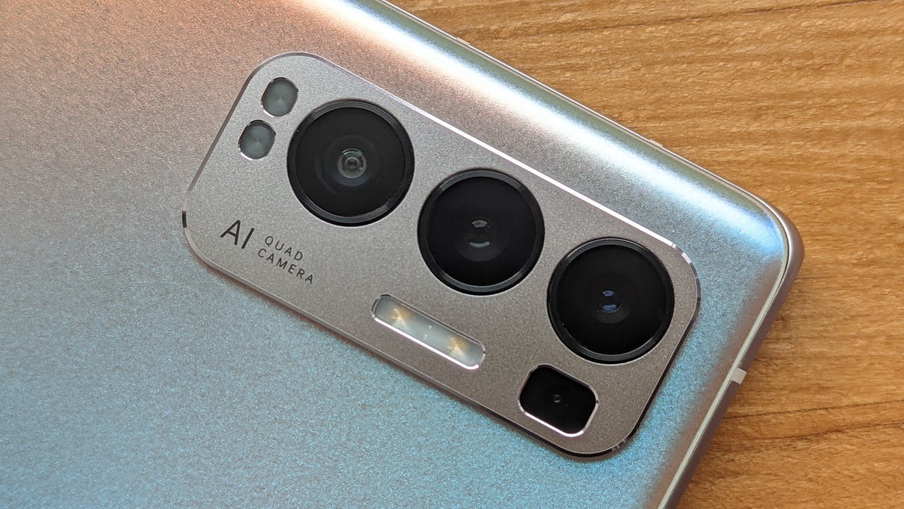 Aan de achterkant van de Oppo Find X3 Neo 5G zie je drie grote ronde cameralenzen. Het toestel beschikt (naast een reguliere lens) ook over een dieptesensor, groothoek- en macrolens. Wanneer je je vinger op de lenzen plaatst, kun je precies nagaan welke lens wanneer ingezet wordt. Opvallend is dat van de grote drie lenzen, de bovenste niet gebruikt wordt voor foto’s, maar om diepte in te schatten. De macrocamera zit op de plek waar je juist de dieptesensor zou verwachten.
