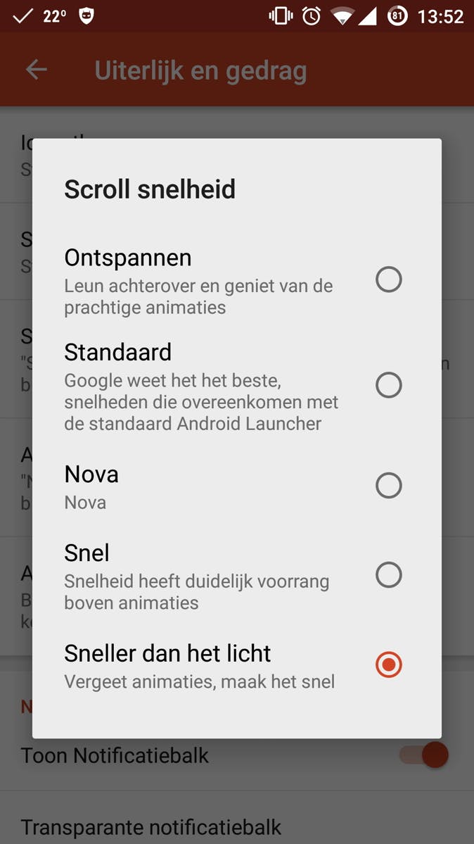 Fabrikanten voegen niet alleen veel apps en processen toe, ook de startschermen zelf drukken zwaar op Android. Zelfs als je een Nexus-toestel hebt, waarbij Google Now sinds Android 4.4 een dominante plek heeft gekregen bij je startschermen. Een zogenaamde 'custom launcher' vervangt deze. Een voorbeeld waar veel aan te tweaken valt, is Nova Launcher. Niet alleen geeft Nova Launcher je Android-toestel het uiterlijk van een schone Android-versie, in de instellingen kun je flink sleutelen om je toestel sneller te laten reageren. Ga naar Nova Instellingen (te vinden tussen de apps in het applicatieoverzicht) en kies bij Scroll Snelheid en Animatie Snelheid voor Sneller dan het licht.