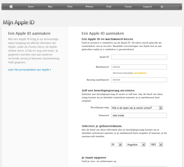 Vul de gevraagde gegevens in en klik onderin de pagina op Maak Apple ID aan.
