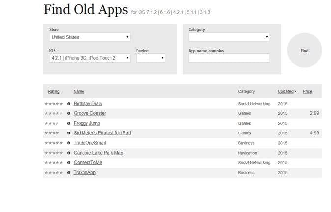Een handige website is de site Findoldapps.com. Hier kun je in het menu bovenaan de pagina aangeven welke iPad of iPhone je gebruikt, welk besturingssysteem hierop draait en vanuit welk land je de App Store normaal gesproken benadert. Je kunt dan ook nog kiezen in welke categorie je apps getoond wilt krijgen. Op zoek naar games? Gewoon even games aanklikken en je krijgt een lijst met alle games die er nog op jouw iPad draaien. Je kunt dit nog verder specificeren door aan te geven in welk jaar de apps voor het laatst een update moeten hebben gehad, of hoe hoog de app gewaardeerd moet zijn. Je kunt hier ook in het zoekvenster een naam intikken en zo direct te zien krijgen of de app voor jouw systeem beschikbaar is.