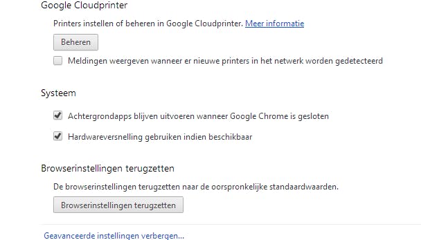 Een andere mogelijkheid om je printer toe te voegen is via het web. Dit gaat het snelste als je gebruik maakt van Google Chrome. Je opent de browser en klikt op Geavanceerde instellingen weergeven. Scroll tot je Google Cloudprinter ziet staan en klik op Aanmelden bij Google Cloudprinter. Het kan zijn dat er beheren staat als je al bent ingelogd. Anders log je in op je Google-account en kies je printers die je wilt toevoegen, waarna je op Printer's toevoegen moet klikken. De printer is nu geïnstalleerd en klaar voor gebruik.