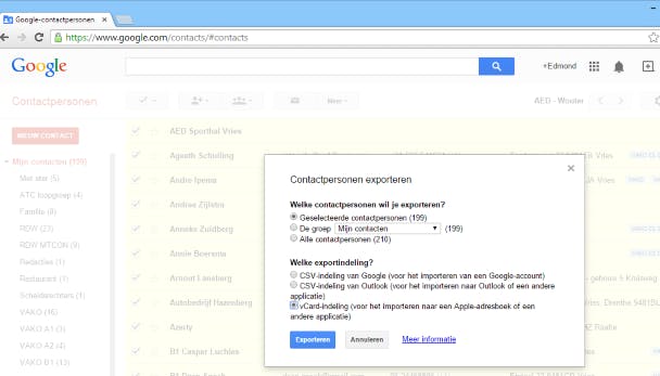 Voor het overzetten van contacten van Android naar iOS volg je precies de omgekeerde weg als van iOS naar Android. Ga naar www.google.com/contacts en log in met je gegevens. Klik naast de tekst Contactpersonen op de knop Selecteren en kies Alle. Je ziet dat alle contactpersonen nu gemarkeerd en geselecteerd zijn. Klik nu op Meer en kies Exporteren. Google geeft je nu enkele keuzes. Laat de optie Geselecteerde contactpersonen ongewijzigd, tenzij je een selectie wilt maken. Kies bij de exportindeling voor vCard-indeling. Klik nu op Exporteren.