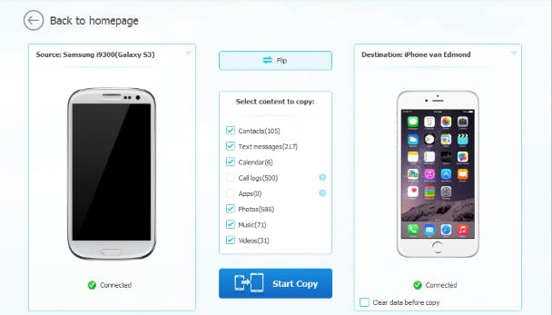 Stap voor stap de informatie van de ene smartphone overzetten naar de andere, is een behoorlijk tijdrovende klus. Heb je daar geen zin in, dan kun je Wondershare MobileTrans proberen, een programma voor Windows en Mac dat contacten, sms, afspraken, foto's, muziek en video's kopieert tussen iPhone en Android en in elke richting. Je kunt de trialversie downloaden, de volledige versie kost 40 dollar. Helaas worden de gegevens van WhatsApp niet meegenomen door dit programma.