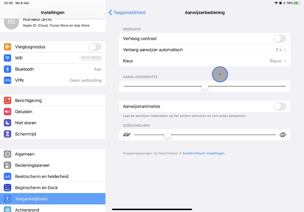 Dan is er de schuifregelaar AANWIJZERGROOTTE. Zoals je wellicht al vermoedt, maak je de cursor - het balletje dus - groter door meer naar rechts te schuiven. Doe dat eens langzaam: op een bepaald punt verschijnt een stip in ‘t midden van de cursor. En die stip is verdraaid handig voor precies mikken op een bepaald punt! Eigenlijk had die stip wat ons betreft standaard in de cursor mogen zitten, ongeacht de grootte. Nu zit je - als je die stip wilt - vast aan een vrij grote aanwijzer, helaas. Maar goed, iPadOS is nog altijd volop in ontwikkeling en wellicht worden er de komende maanden en versies meer opties uitgerold! Check die Instellingen-app zo af en toe eens na een iPadOS-update dus, zouden we zeggen.