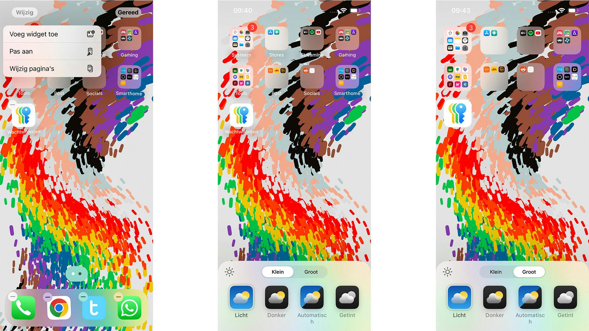 P.S. Soms lijkt het alsof je nog een app zou kunnen plaatsen, maar dan werkt het toch niet. Bijvoorbeeld wanneer je een vergroot appicoon boven de app-lade onderin zet. Hoewel het lijkt alsof er genoeg ruimte is voor nog een app, laat iOS 18 dat simpelweg niet toe. Gelukkig is er wel een oplossing: maak gewoon een Wextra home screen aan! Druk daarvoor op een app, kies Wijzig beginscherm totdat de app gaat trillen en er een minnetje verschijnt en sleep hem dan naar rechts, naar een nieuwe pagina. Op een iPhone kun je maximaal 15 thuisschermen (home screens) hebben. Elk scherm biedt ruimte voor 24 apps (6 rijen van 4 iconen) op iPhones zonder fysieke homeknop, of 20 apps (5 rijen van 4 iconen) op iPhones met een homeknop.