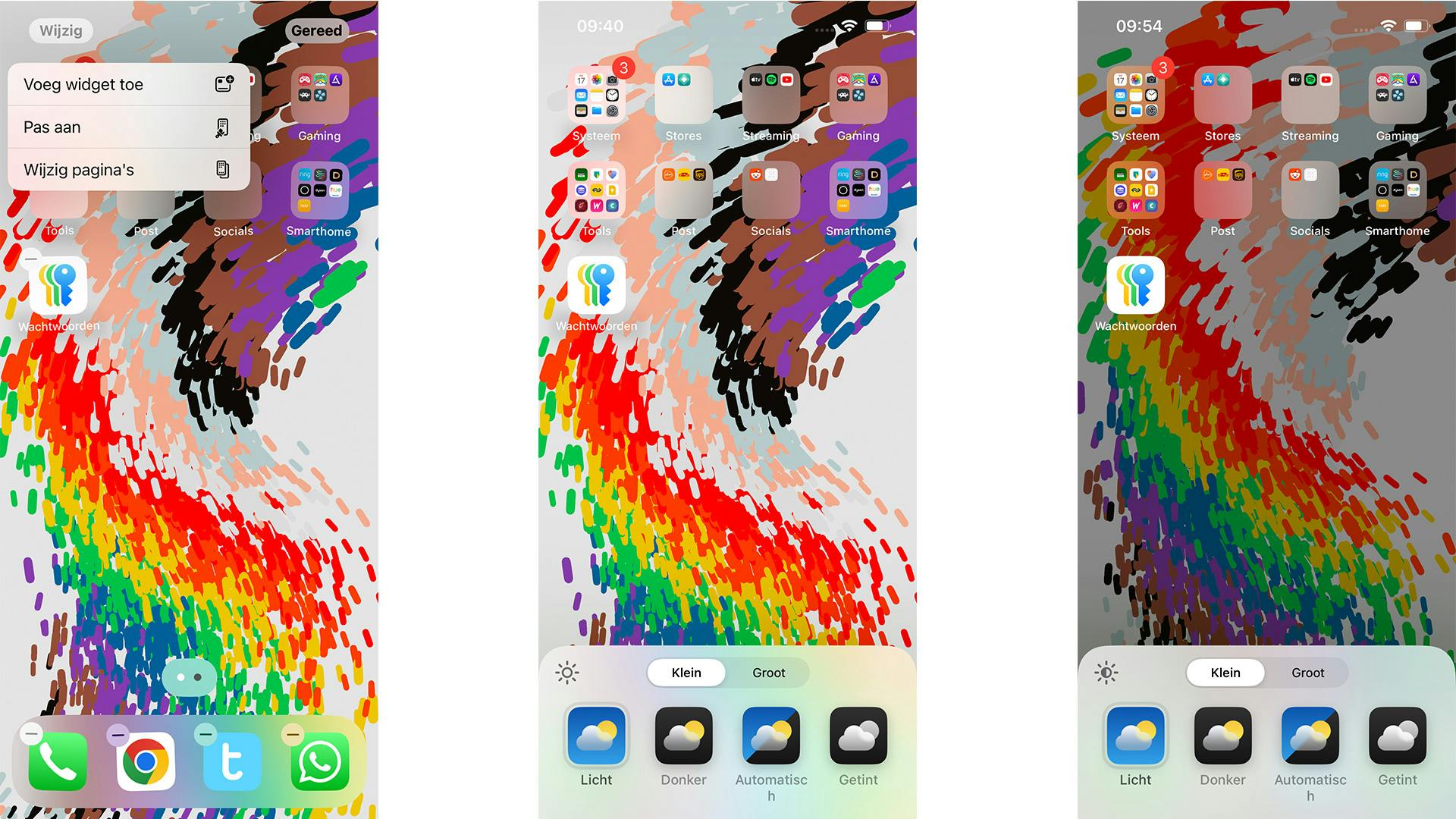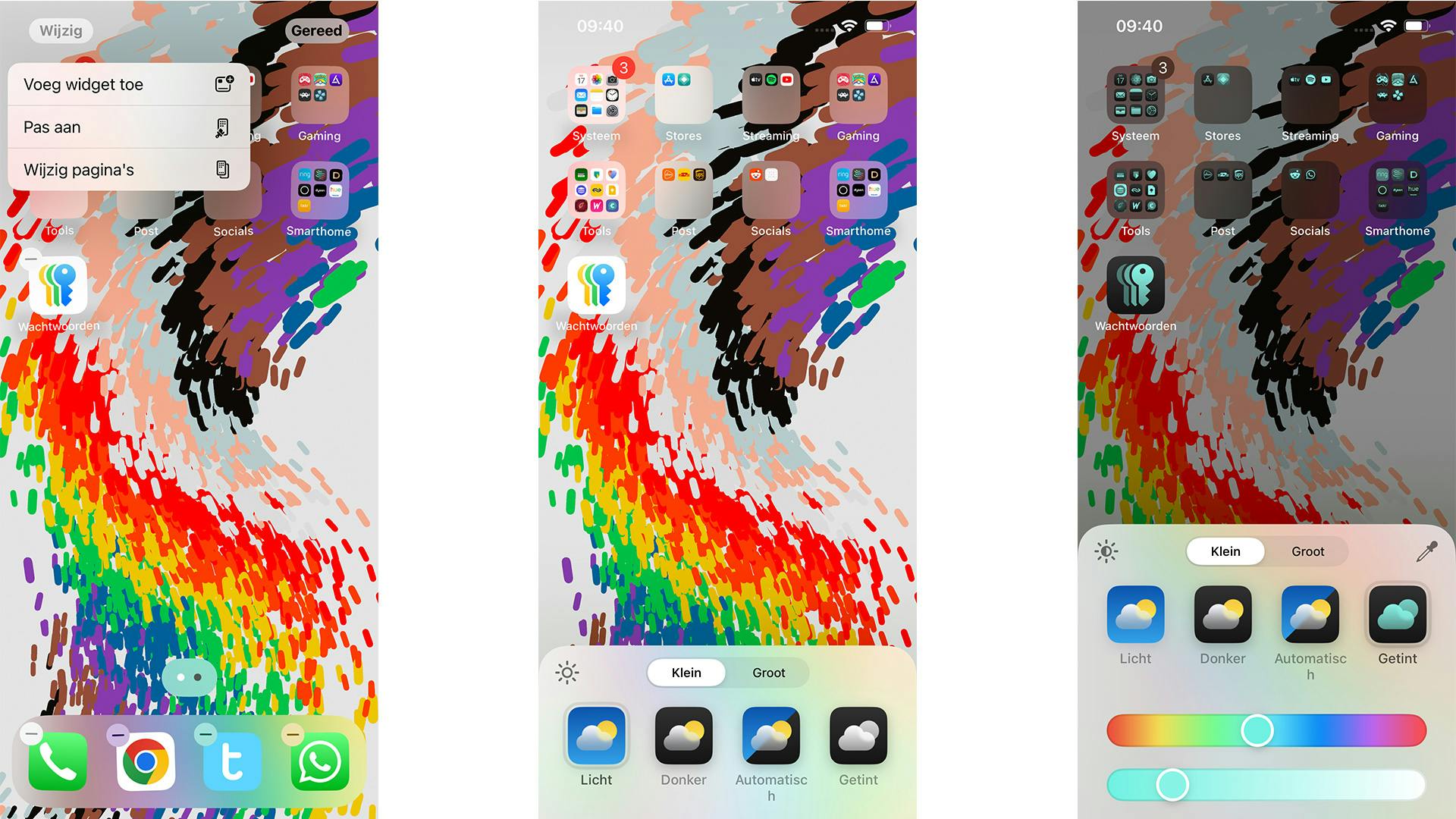 Je kunt nu kiezen voor een licht of donker thema, of bepalen dat dit automatisch wisselt op basis van zonsondergang en -opkomst. Maar je kunt de app-iconen ook een bepaalde tint meegeven. Tik daarvoor op de knop Getint, helemaal links in beeld (in het venster onderin). Dan zie je twee balken in beeld staan. Met de bovenste bepaal je de kleur en met de onderste de verzadinging. Onthoud dat wanneer je hier iets aanpast, de kleur van élke app verandert – je kunt dus niet één enkel icoon aanpassen. Je kunt eventueel ook de oogdruppelaar gebruiken om een specifieke kleur van de achtergrond te gebruiken.