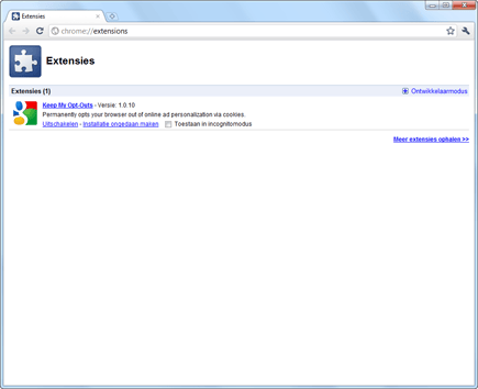 Het enige dat u hiervoor hoeft te doen is in Chrome te surfen naar de extensiepagina en tweemaal achter elkaar te klikken op Installeren. De extensie is nu geïnstalleerd. Dit zorgt er weliswaar niet voor dat u helemaal geen advertenties meer ziet, maar rekent wel af met gepersonaliseerde advertenties. Overigens updatet Google de extensie in fases. Het bedrijf is begonnen met het ‘blokkeren’ van Amerikaanse gepersonaliseerde advertenties, nu is Europa aan de beurt en daarna de rest van de wereld. De extensie zal dus in toenemende mate effectief blijken. Wilt u om wat voor reden dan ook de extensie weer uitschakelen, dan klikt u op Google Chrome aanpassen en beheren (pictogram van gereedschap rechtsboven) en vervolgens op Extra / Extensies. U kunt dan klikken op Uitschakelen of Installatie ongedaan maken.