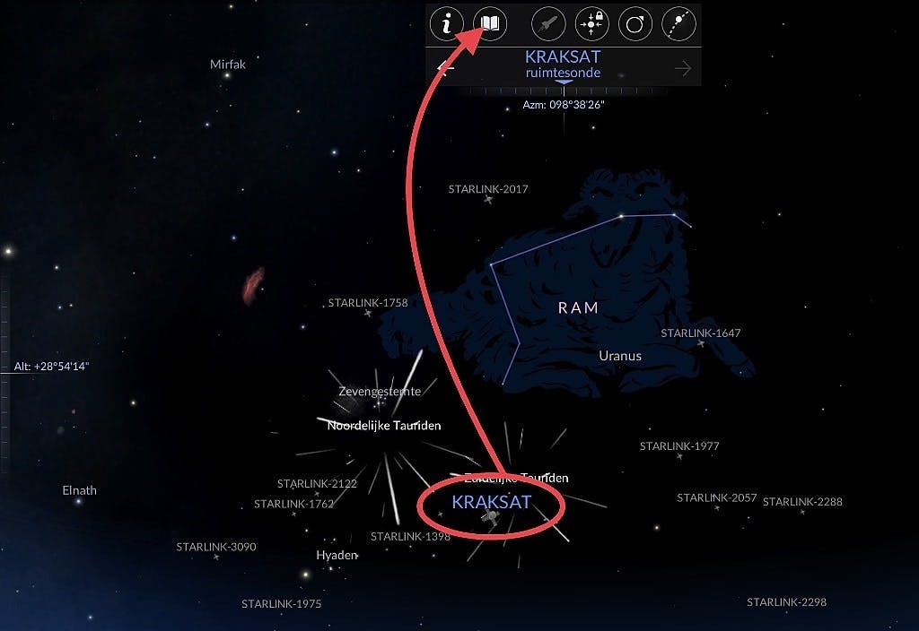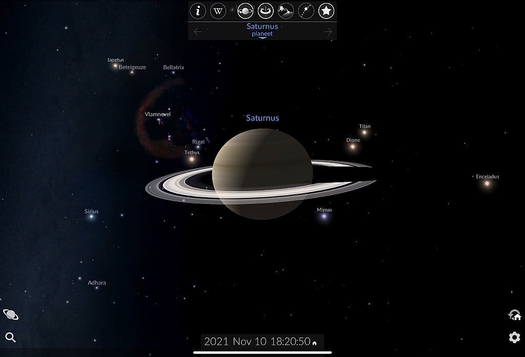 Overigens heeft de naam van de app – Redshift – niks te maken met die rode weergavemodus. Die naam is afkomstig van een natuurkundig verschijnsel. Door de enorme afstanden die licht van extreem veraf gelegen objecten moet afleggen alvorens het hier zichtbaar is, wordt de golflengte opgerekt. Dat leidt tot een ‘verroding’ van de kleur, ofwel een red shift. Dat echter geheel terzijde. Je kunt de app in ieder geval gebruiken om flink ver in te zoomen op onderdelen in de lucht. Nu kun je met een verrekijker al veel meer details zien dan met het blote oog; even doorzoomen op een ster om deze vervolgens gedetailleerd in beeld te krijgen lukt daarmee (en ook niet met de beste telescopen ter wereld) niet. Redshift Sky is wat dat betreft een uitkomst: het leert je in een handomdraai veel meer dan met de beste papieren sterrenkaart ooit mogelijk was. Inzoomen doe je door een spreidbeweging op de sterrenweergave te maken. Of tik op een object en dan op de raket in de knoppenbalk die daarop (meestal) opent. Je ‘vliegt’ dan met gezwinde spoed naar het hemellichaam! Terugkeren naar je standplaats doe je door een tik op de huisknop rechtsonder in beeld. Per object (en dat geldt ook voor satellieten en dergelijk is meer info op te vragen via de knoppenbalk en de boekknop. Niet élk object beschikt over info, maar veel wel.