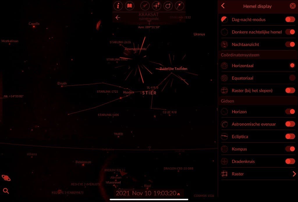 Het is tevens zaak de hemelgegevens zo af en toe eens te updaten (doe dat zeker na de eerste start van Redshift Sky). Tik weer op het tandwiel rechtsonder en dan op Downloads. In principe kun je alle hier staande items aantikken en updaten. Dit zorgt ook meteen weer voor wat extra gegevens, waaronder live weergave van (bekende) satellieten en ruimtestations. Ben je eenmaal aan het observeren geslagen, dan ontdek je waarschijnlijk al heel snel dat je ogen zich steeds opnieuw van het heldere scherm van je smartphone of tablet moeten aanpassen aan de nachtelijke hemel. Hoe langer je kijkt naar de zwarte, heldere lucht, hoe meer je ogen aan het duister gewend raken en hoe meer je ziet. Dat voordeel wordt meteen teniet gedaan door een blik op je toestel. Zelfs het helemaal terugregelen van de schermhelderheid is dan nog te veel van het goede. Nu geldt dat je ogen niet heel gevoelig zijn voor rood licht. Door op het tandwiel rechtsonder te tikken en dan op Hemeldisplay verschijnt een schakelaar met de naam Nachtaanzicht. Zet deze aan, en liefst meteen ook de schakelaar achter Donkere nachtelijke hemel. Schroef vervolgens ook dan de helderheid van je telefoon- of tabletscherm terug. Ga je nu buiten waarnemen, dan heb je geen last van de enorme helderheidsverschillen tussen scherm en hemel.