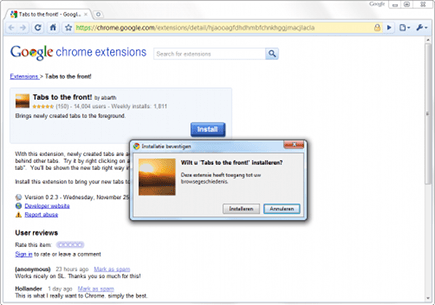 In Chrome is het standaard niet mogelijk om nieuwe tabbladen automatisch te openen, iets wat bij de meeste andere browsers wel kan worden ingesteld. Dit gemis lost u op met de kleine plug-in Tabs to the front. Dankzij deze software wordt een nieuw tabblad automatisch naar de voorgrond gehaald als u er een link in opent. Simpel, effectief en voor velen een eind aan een kleine bron van ergernis. De kans is aanwezig dat in een volgende versie van Chrome deze mogelijkheid standaard wordt ingebouwd. Maar zolang dit nog niet is gebeurd, hebt u in elk geval een work-around. Tabs to the front