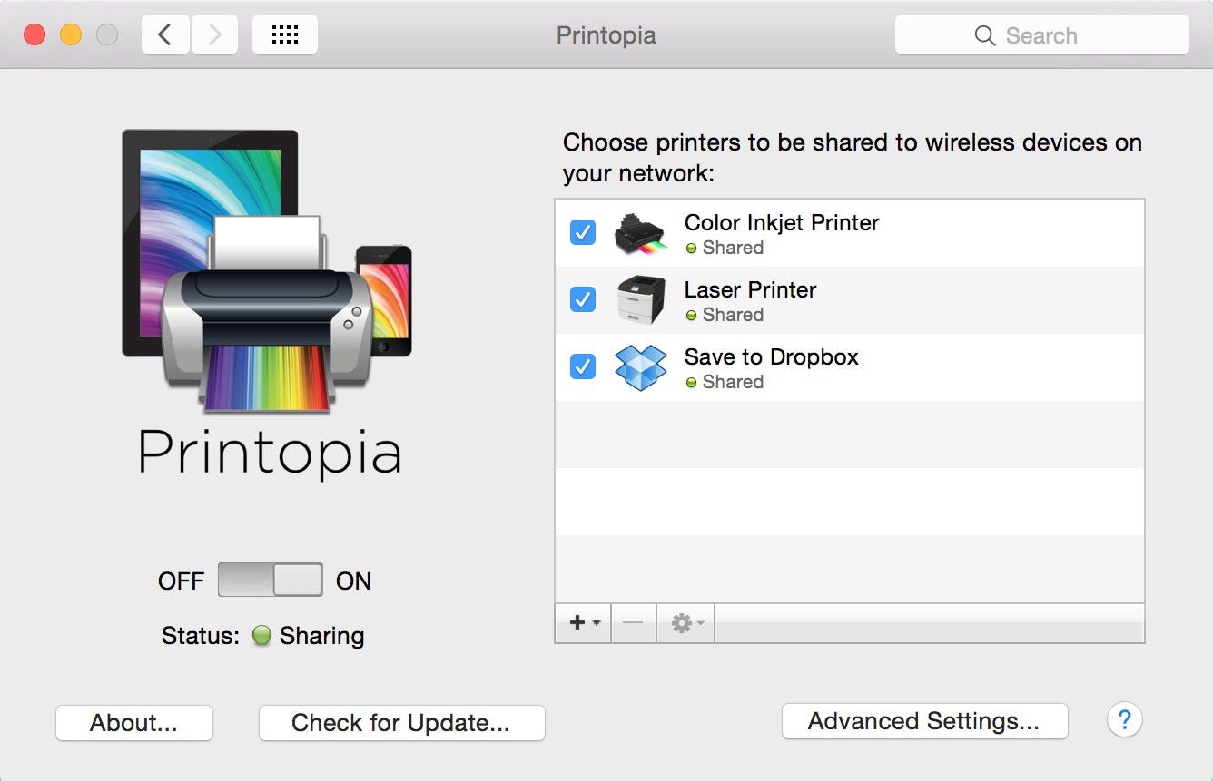 Je zet een goedwerkende maar iets oudere printer toch niet bij het schroot omdat hij geen AirPrint ondersteunt? Plaats de tool Printopia op je Mac, op je iPhone of iPad hoef je niets te installeren. Vanaf dan kun je iedere printer gebruiken als AirPrint-toestel. Printopia ontvangt het signaal van het mobiel toestel en stuurt de informatie naar de printer. Omdat de printer is aangesloten op de Mac wordt het bestand onmiddellijk afgedrukt. Je mag de software eerst gratis proberen, daarna kost hij 19,99 dollar.