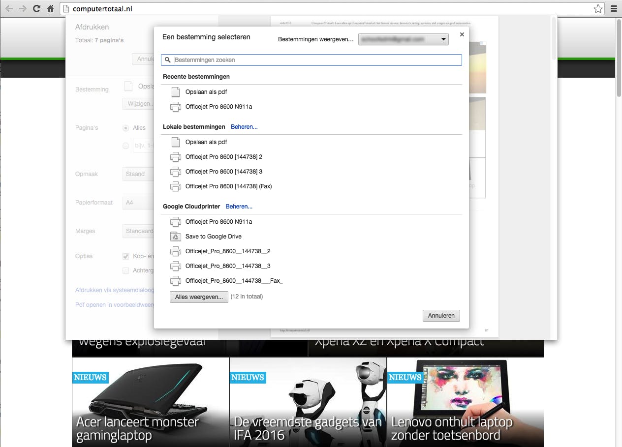 Nadat je de printer(s) hebt toegevoegd wil je deze techniek uiteraard uittesten. Doe dat vanuit Google Chrome en surf naar om het even welke webpagina. Vervolgens gebruik je de toetsencombinatie Ctrl+P op pc of Cmd+P op de Mac om het dialoogvenster Afdrukken te zien. In het vak Bestemming kies je de printer. Bij de test zal daar automatisch de standaardprinter verschijnen, maar via de knop Wijzigen kom je bij de geïnstalleerde Google Cloudprinters. Selecteer zo’n cloudprinter. Klik op Afdrukken en het geselecteerde document schuift enkele seconden later uit je printer.