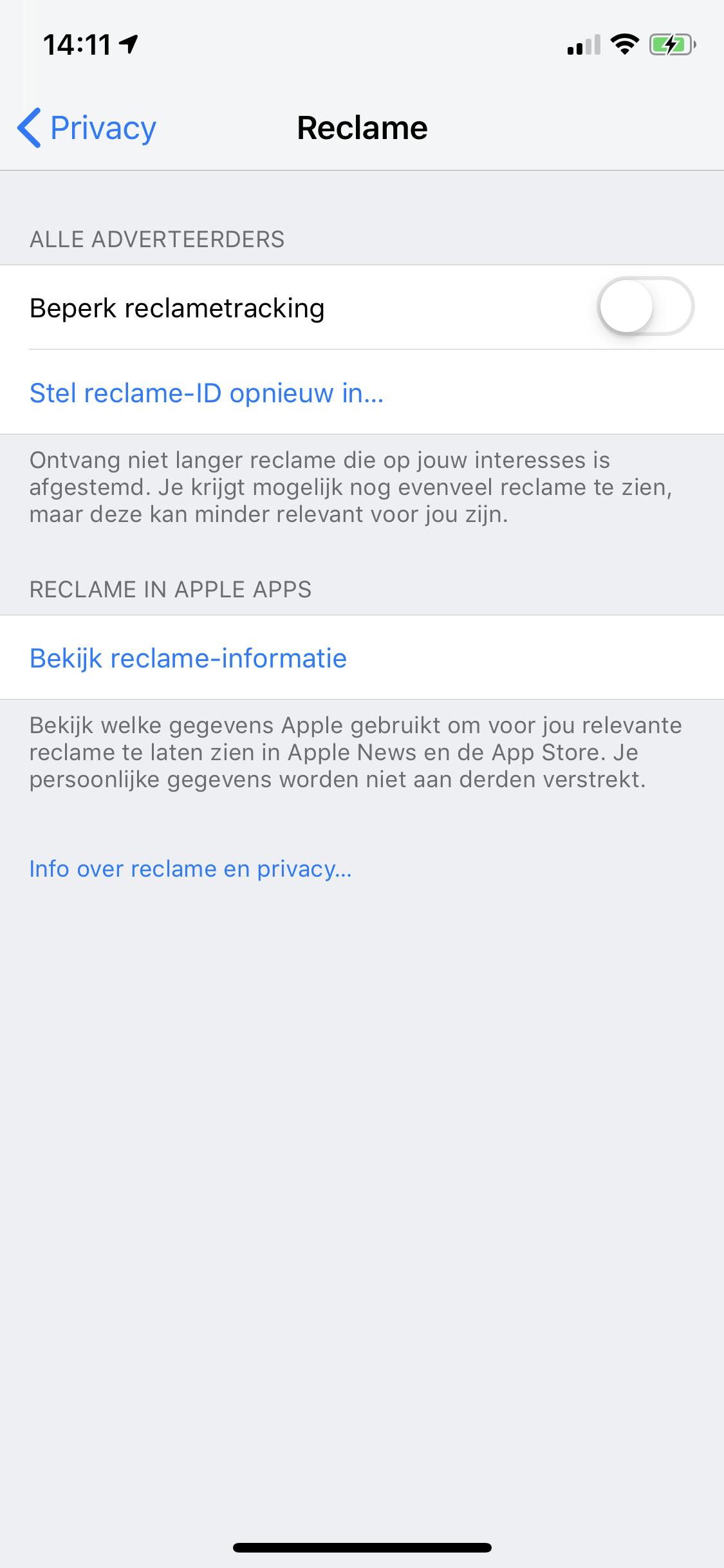 Om hier iets aan te doen, druk je op Instellingen en vervolgens op Privacy, Reclame. Daar kun je de optie Beperk reclametracking inschakelen. Je krijgt dan nog steeds advertenties en reclame te zien, maar niet langer gebaseerd op wat je doet. Je kunt ook nog drukken op Stel reclame-ID opnieuw in om de informatie die men reeds heeft, te wissen.