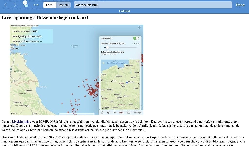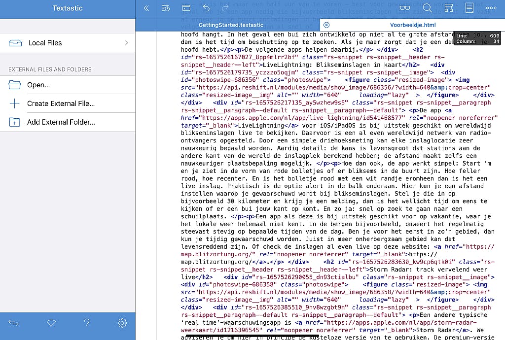 Ga je zelf HTML-code tikken – wat soms best handig kan zijn, al was het maar om hier of daar snel wat handmatig aan te passen – dan komt de preview-functie van Textastic prima van pas. Tik of klik daarvoor op het brilletje in de knoppenbalk bovenaan (rechts). Je ziet nu een preview van wat je noeste arbeid aan resultaat biedt. Daarvoor intern een webserver gebruikt.