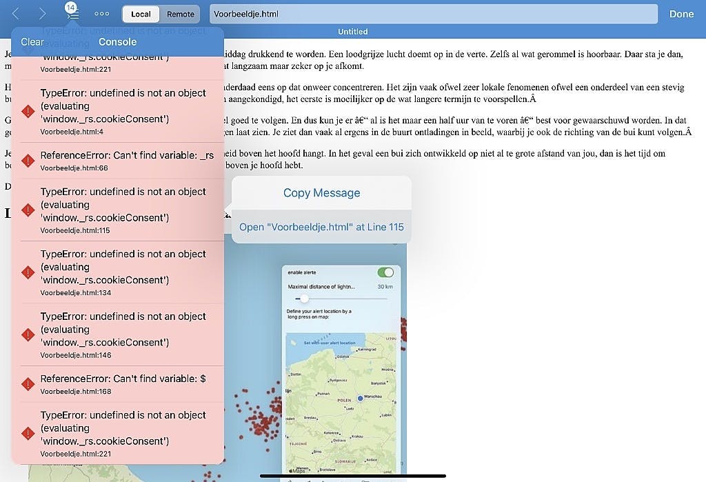 Zoals beloofd kan Textastic ook – voor en aantal talen – code herkennen. In de bovenstaande afbeelding zie je naast de knoppen < en > een streepjesknop met daarin een van een getal voorzien balletje. Klik daar op en je ziet een lijst van aangetroffen fouten. Om direct naar een probleem te springen, klik je op een fout en dan op Open (gevolgd door bestandsnaam en regelnummer). Je springt dan in de broncode meteen naar de aangetroffen fout.