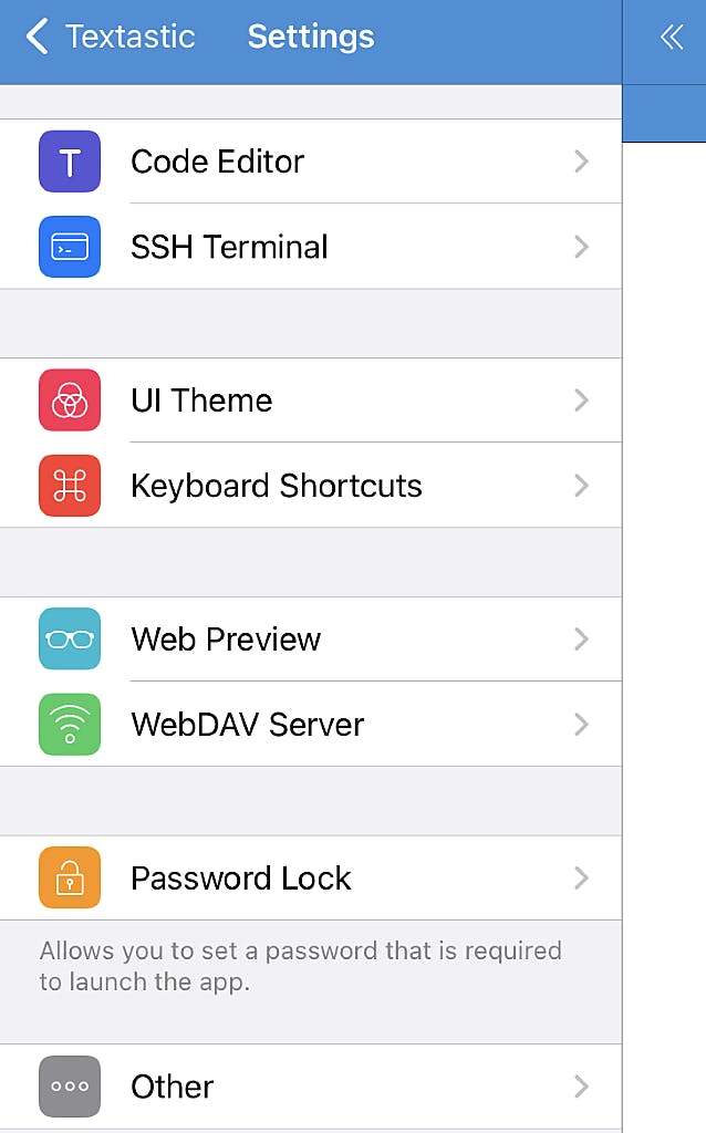 Via de knop met de drie puntjes helemaal rechtsboven krijg je toegang tot een extra menu. Met daarin onder meer de mogelijkheid tot delen, mailen, afdrukken en een handige Copy All-functie. Zoals gezegd kun je ook gebruik maken van online opslag en SSH, waardoor je in principe rechtstreeks aan code op een server kunt werken. En daarmee is Textastic een stuk gereedschap dat in geen enkele virtuele gereedschapstas van een coder zou mogen ontbreken.