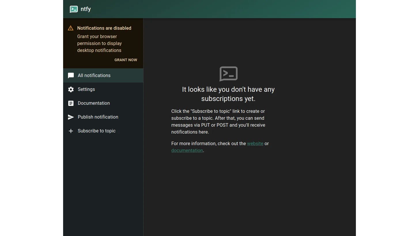 Als alles goed gaat, is de webinterface van ntfy daarna bereikbaar op het ingestelde domein of ip-adres. Bovenaan links zie je een melding Notifications are disabled. Klik op Grant now om notificaties in je webbrowser toe te staan, en bevestig dit daarna in het dialoogvenster dat je webbrowser toont.