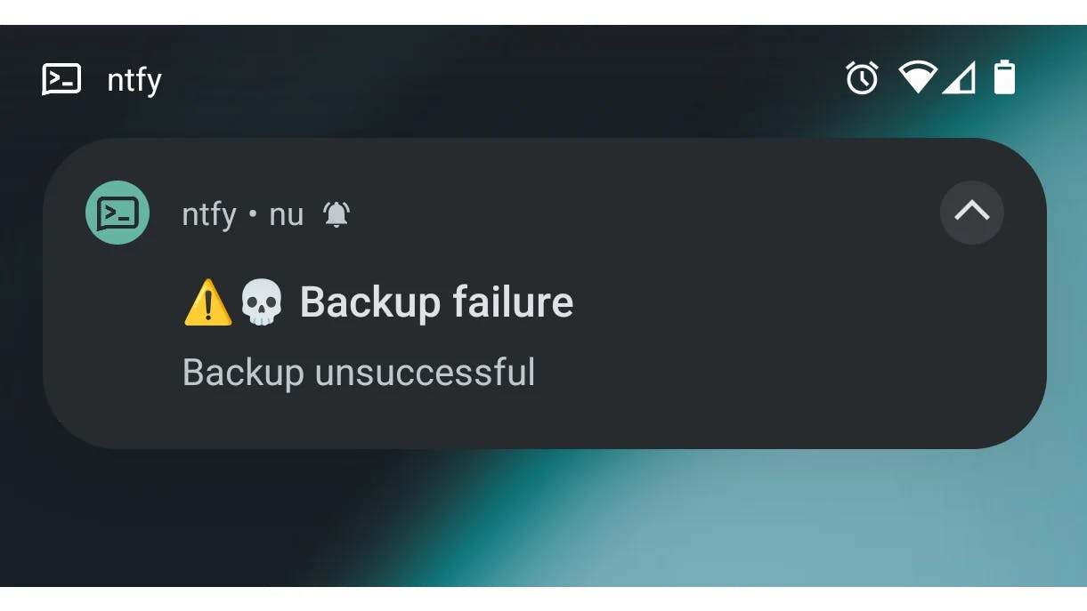 curl -u backup:password -H "Title: Backup failure" -H "Priority: urgent" -H "Tags: warning,skull" -d "Backup unsuccessful" ntfy.example.com/backup