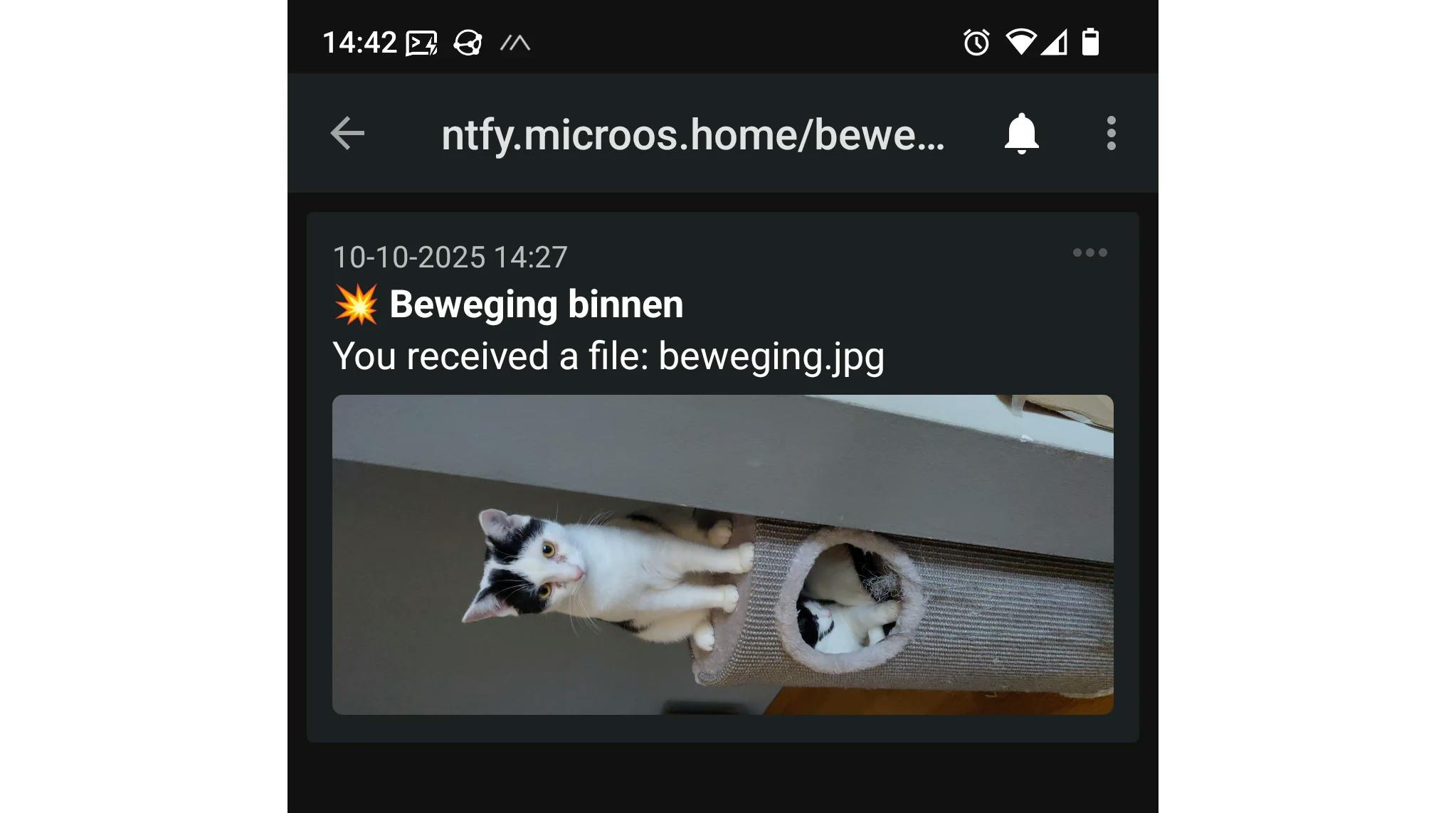 Ntfy kan ook plaatjes sturen, bijvoorbeeld een foto van een ip-camera die beweging detecteert, maar niet in combinatie met een tekstbericht. Om een bestand naar ntfy te uploaden met curl in een http PUT-aanvraag gebruik je de optie -T en de bestandsnaam. Met de header Filename voeg je de bestandsnaam toe die de ntfy-app je moet tonen. Dat ziet er dan als volgt uit: